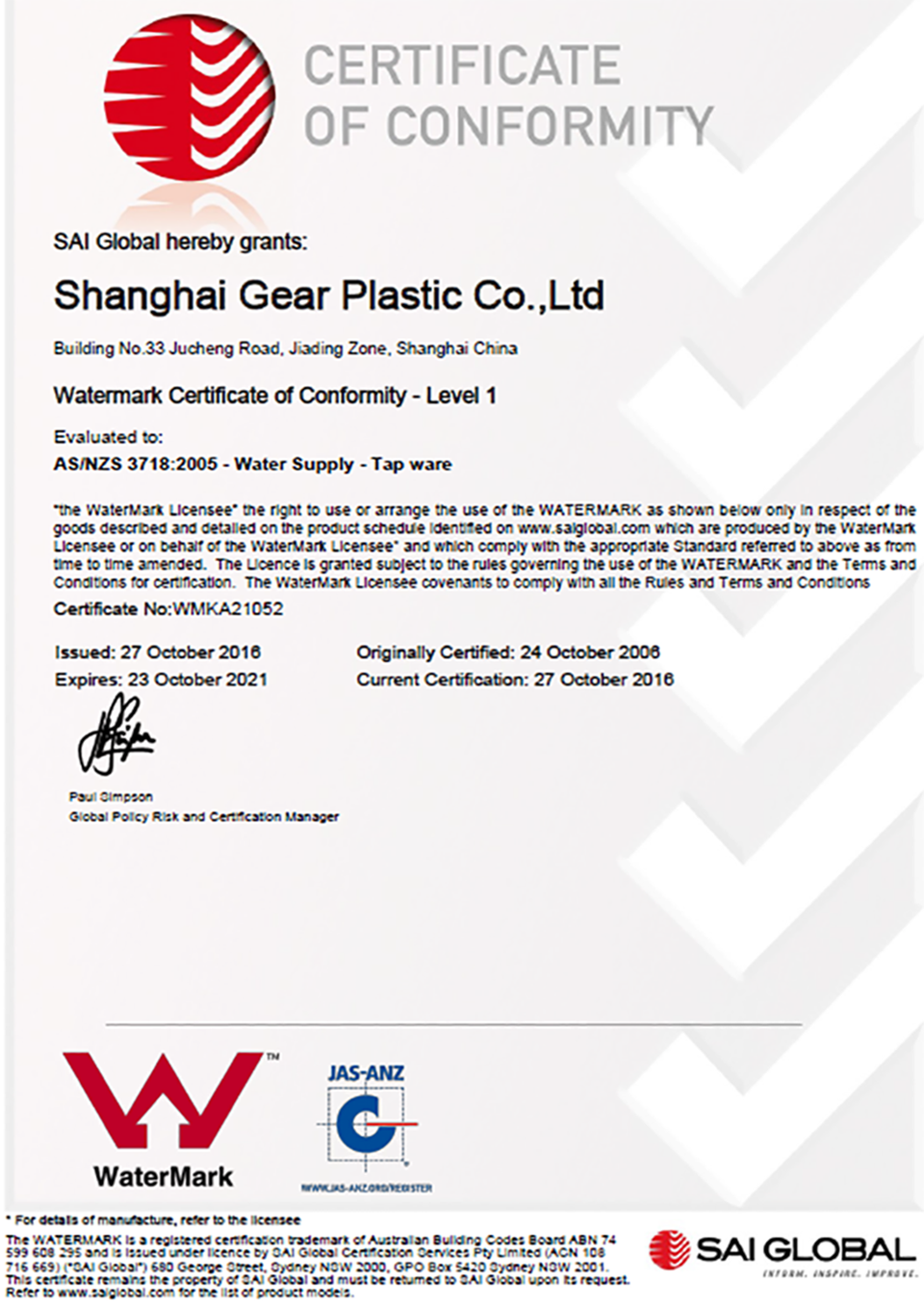 Our products have passed: US NSF, UPC, European EN817, EN200, EU CE, ROHS, PAHS, Germany W270, DVGW/KTW, UK WRAS, France ACS, NF, Australia Water Mark, China GB18145 and other international testing certification.